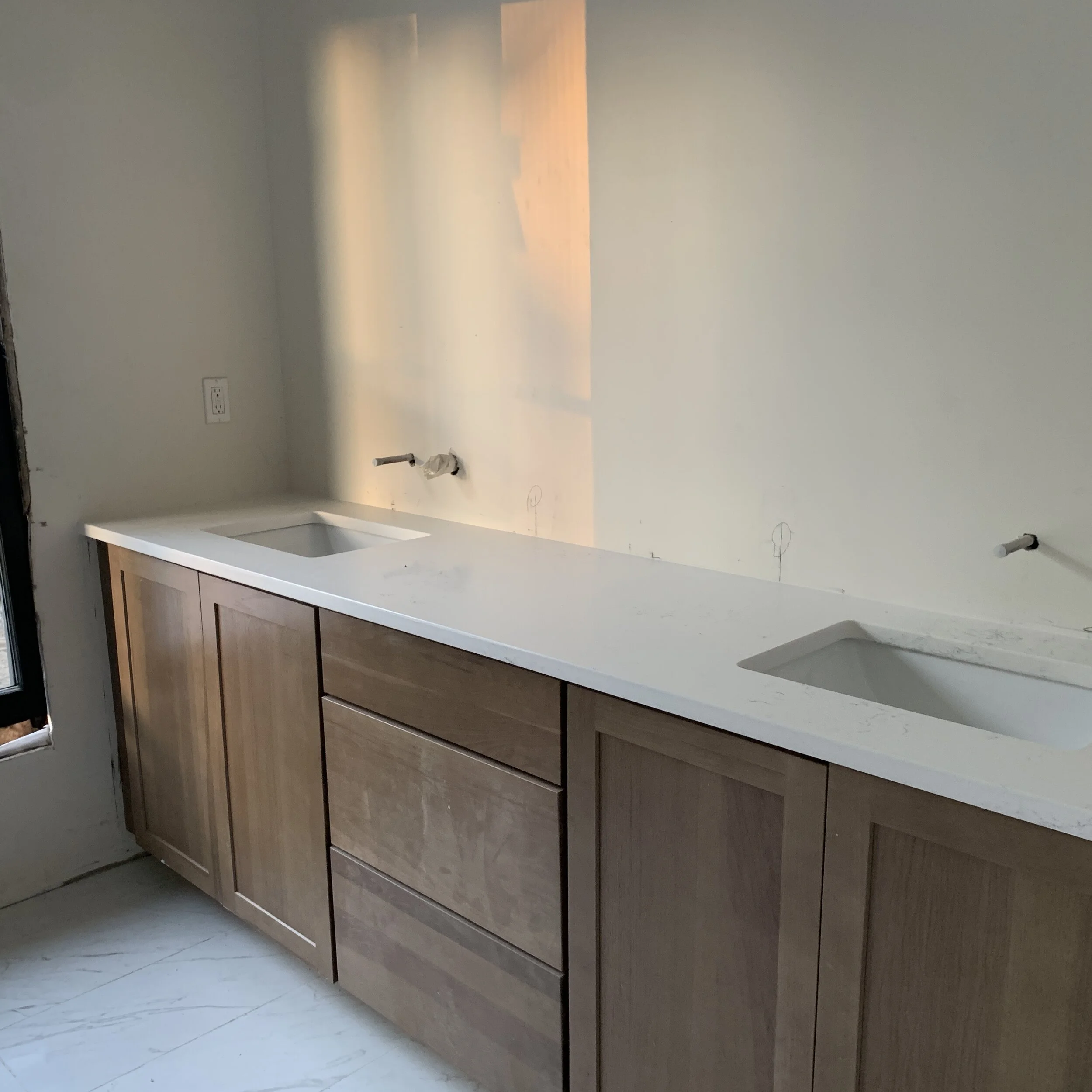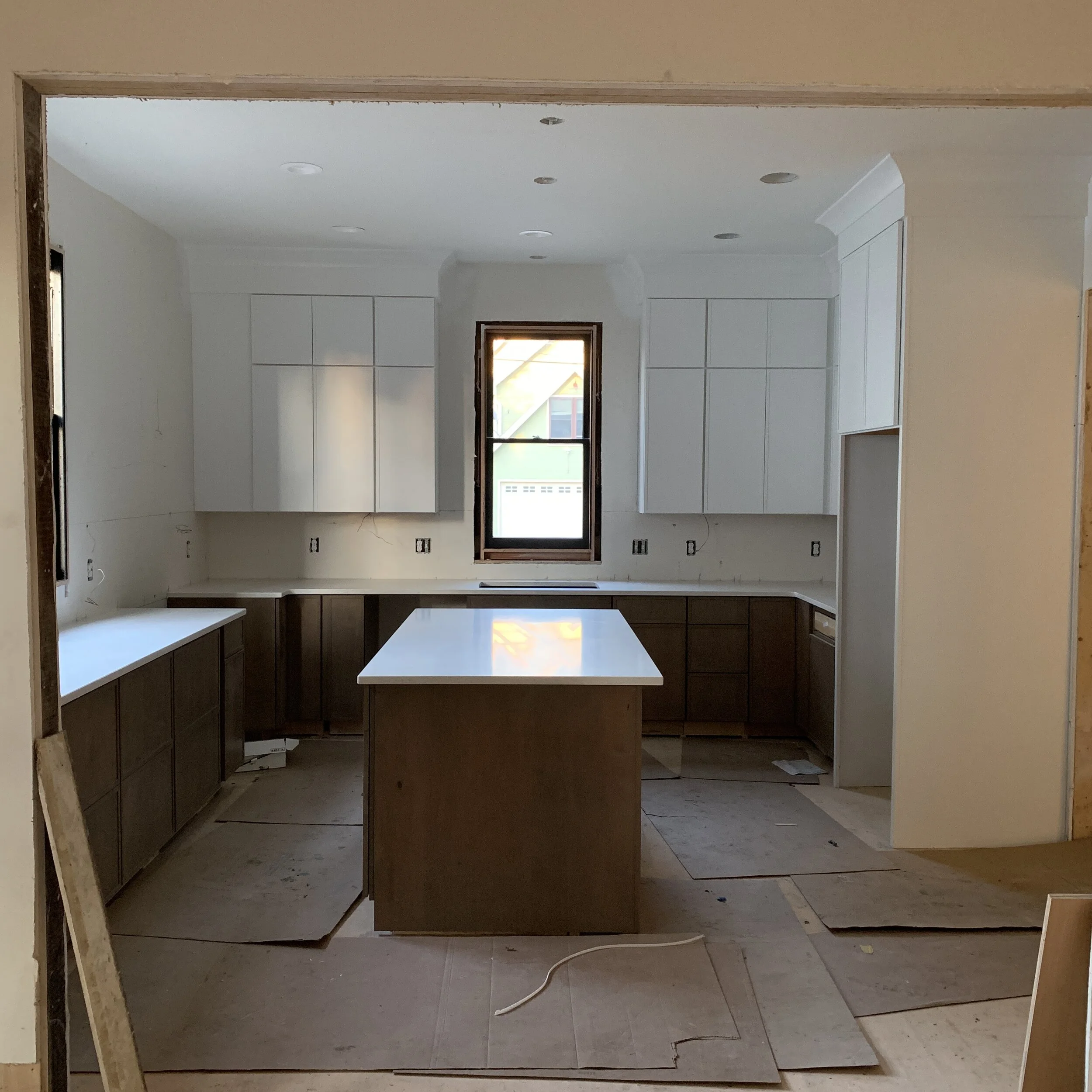 Kitchen with custom cabinetry; quartz countertops; range hood; new appliances (provided)